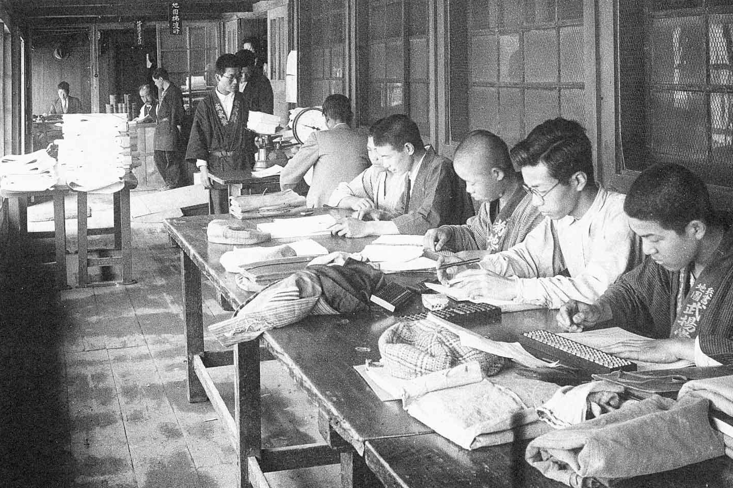 事務室で、「武揚堂」名のハッピの社員が見えます。